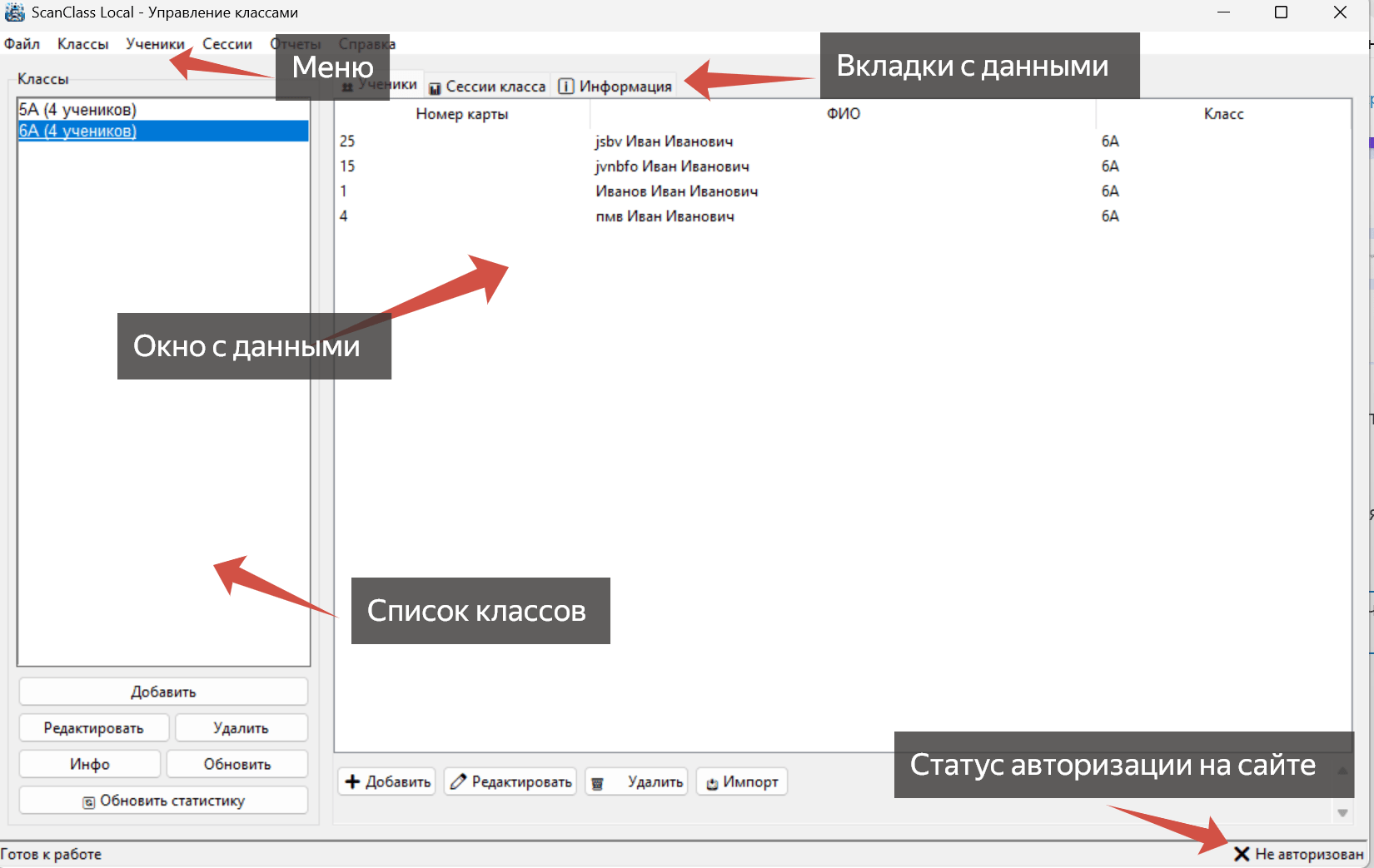 - Сопоставить с текущим классом — основное окно, позволяет назначить сессию определенному классу и посмотреть результат.