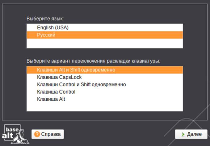 - Оставьте выбранным язык «Русский», выберите предпочтительный вариант переключения раскладки клавиатуры и нажмите кнопку «Далее».