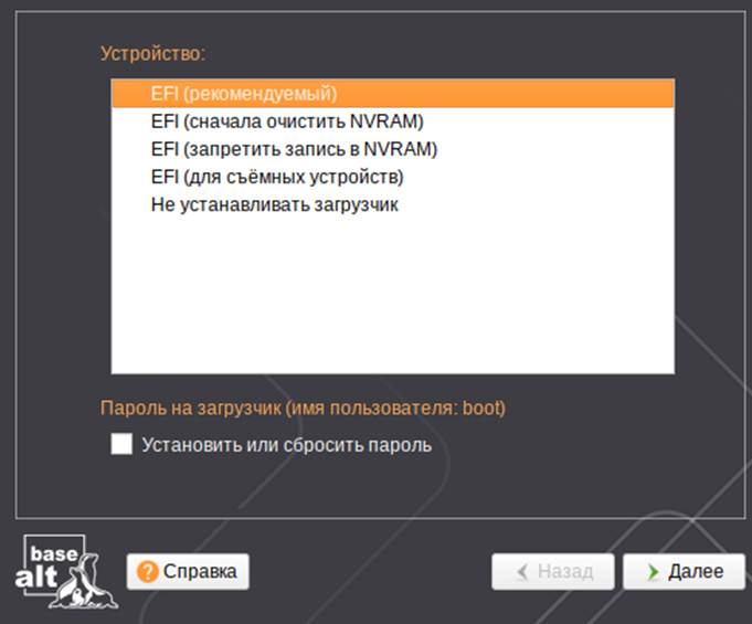 - Оставьте выбранным рекомендованное устройство загрузки «EFI (рекомендуемый)» и нажмите кнопку «Далее».