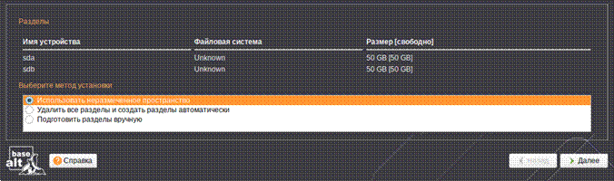 - Оставьте выбранным метод установки «Использовать неразмеченное пространство» и нажмите кнопку «Далее» для перехода к следующему шагу.