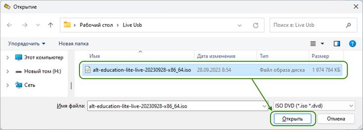 - В открывшемся окне проводника укажите путь к файлу образа (*.iso) ОС и нажмите кнопку «Открыть».